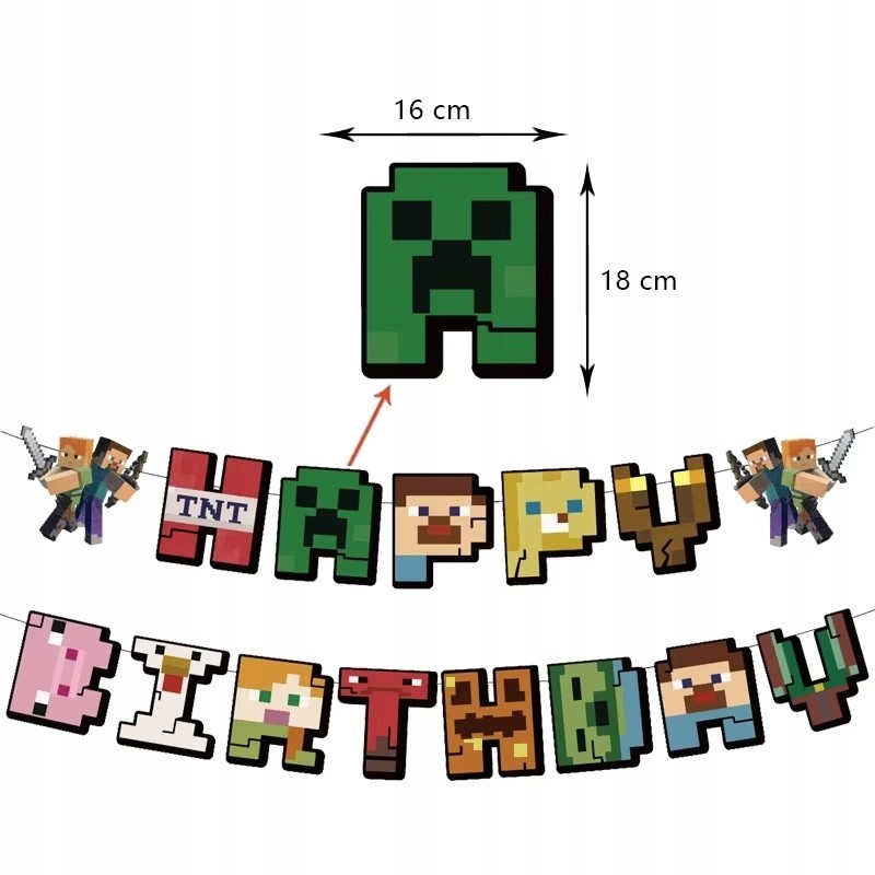 - Napisy: „HAPPY BIRTHDAY” – każda litera w stylu znanych postaci i bloków z gry (Steve, TNT, Creeper, zwierzęta, itd.)