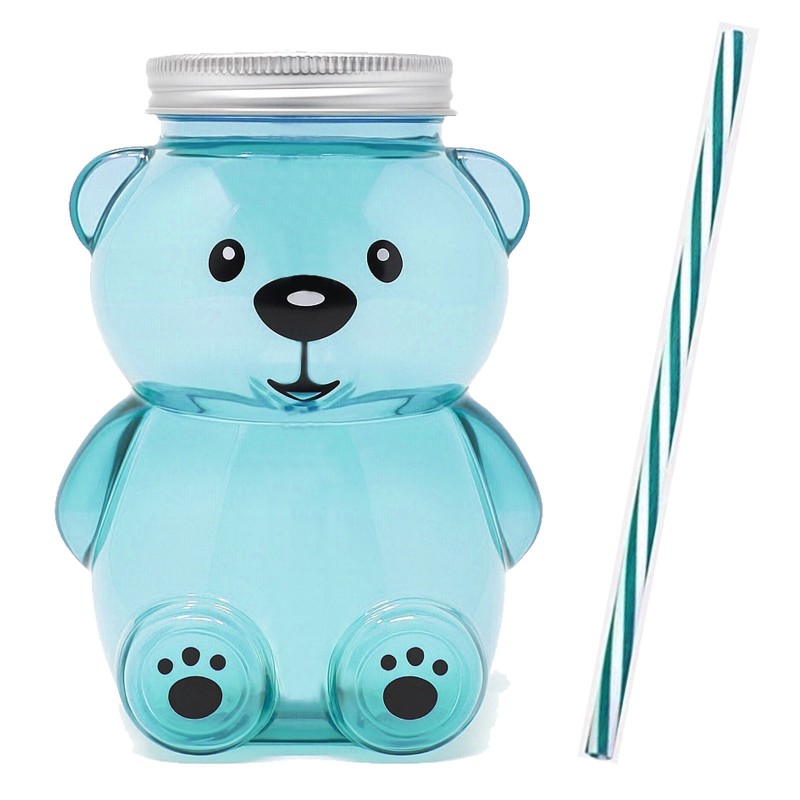Przedmiotem aukcji jest buteleka w kształcie misia z zakrętką i słomką wielokrotnego użytku. Idealne na wodę, sok, koktajle, lemoniadę czy kolorowe drinki.