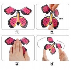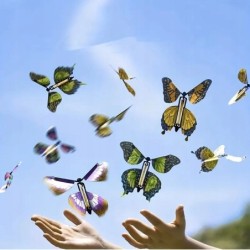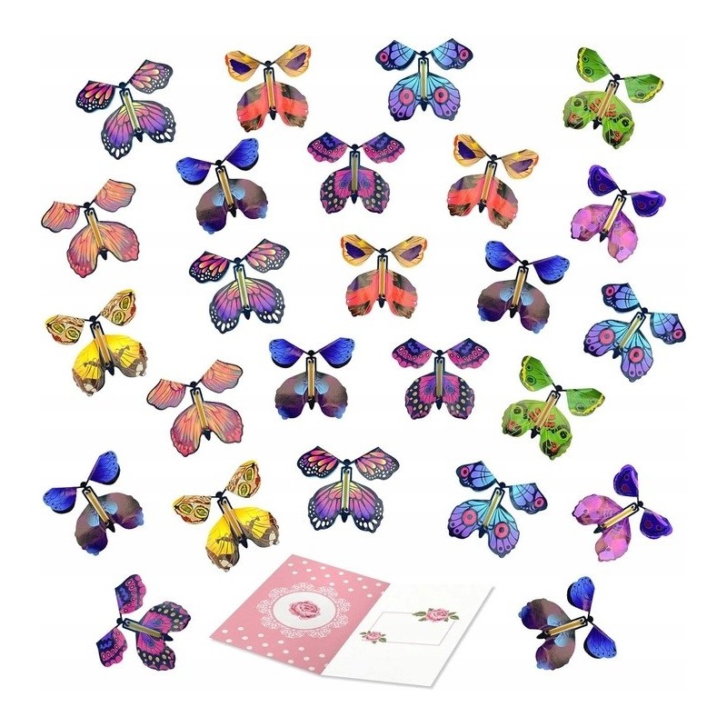 To lekkie, kolorowe motyle napędzane gumką, które po nakręceniu szybują w powietrzu niczym prawdziwe! Wystarczy nakręcić skrzydełka 30–50 razy, schować motyla np. do książki lub w dłoniach, i... magia gotowa!