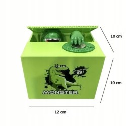 Przedmiotem aukcji jest unikalna skarbonka w kształcie zielonego pudełka, ozdobiona grafiką dinozaura i napisem „Monster”. Skarbonka nie tylko służy do oszczędzania, ale także dostarcza masę zabawy! W momencie, gdy wrzucisz monetę na wyznaczone miejsce, spod klapki wyłania się zielona łapa dinozaura, która chwyta pieniążek i chowa go w środku! Każde użycie to niespodzianka i wywołuje uśmiech na twarzy użytkownika.