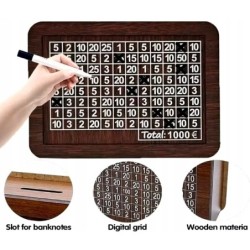 Skarbonka wykonana jest z eleganckiego drewna, a na tablicy widnieją różne kwoty do wykreślenia – od 5 do 75 jednostek. Za pomocą markera suchościeralnego (dołączonego do zestawu) zaznaczasz wykreślone kwoty, widząc swoje postępy w oszczędzaniu. Wybierając dowolne kwoty do wykreślenia, sam decydujesz, w jakim tempie odkładasz pieniądze!